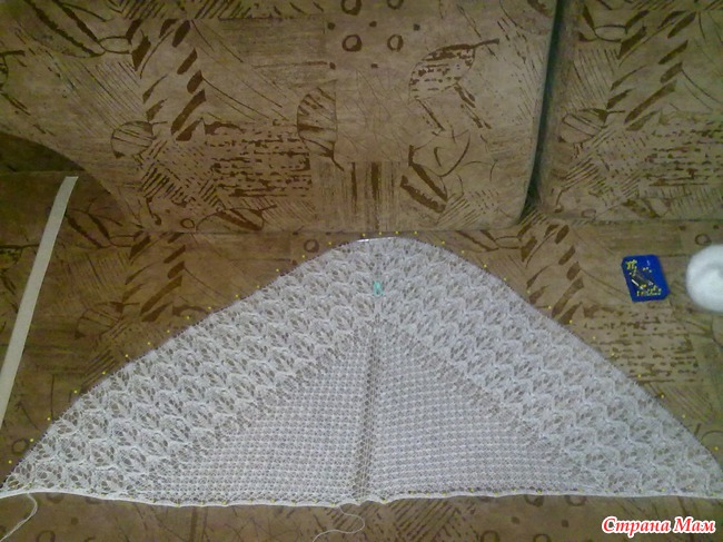 ), сильно растянуть шаль не получилось, поэтому только в нескольких местах наколола иголочками с чуть большим растяжением (чтобы увидеть прорисовку листиков.).