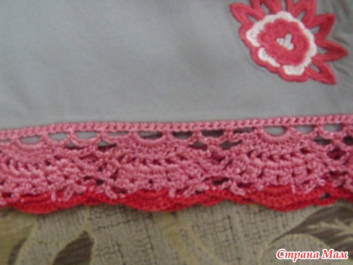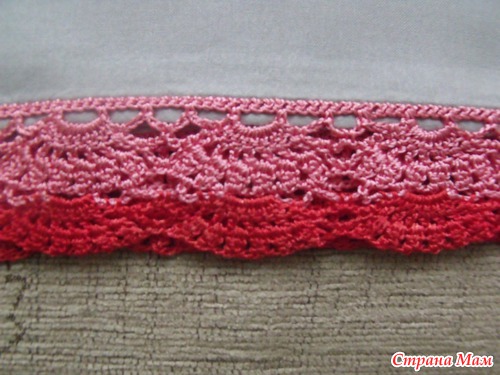 Обвязку крючком ткани раньше не делала никогда. Самым сложным за ткань было зацепиться, т к она тонкая и прокалывать ее крючком не представлялось возможным. Я сделала так: обшила ее по фабричным швам ниткой для обвязки ( швом "назад иголку" ). Затем в каждый стежок провязала столбик без накида, а далее уже вязала узор по схеме.