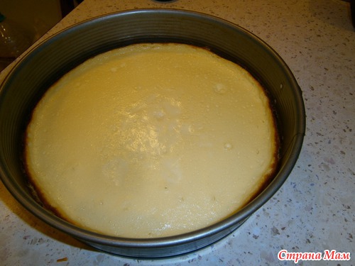 Всё это богатство выливаем на остывший бисквит и опять в разогретую духовку, на 25-30 минут, пока крем не запечётся. И опять я ставлю форму выше среднего положения, т. к. в первый раз бисквит в самом низу не пригорел, но стал суховатым.