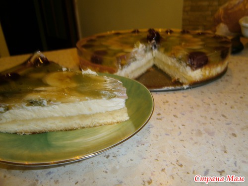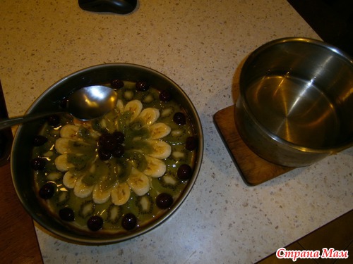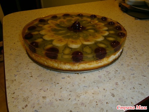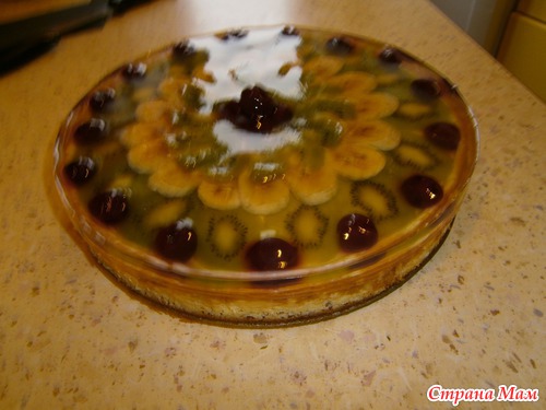 Потом украшаем всеми доступными фруктами-ягодами. В оригинале рецепта - клубника, у меня: киви, банан и остатки вишни в собственном соку.