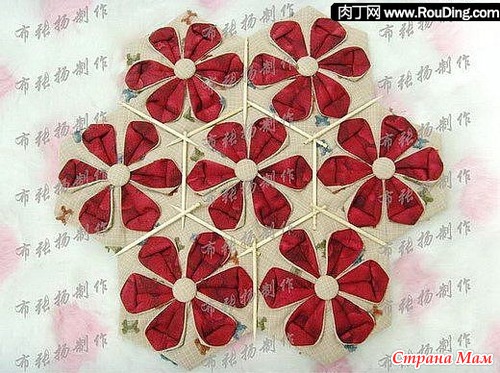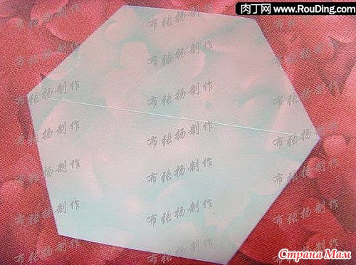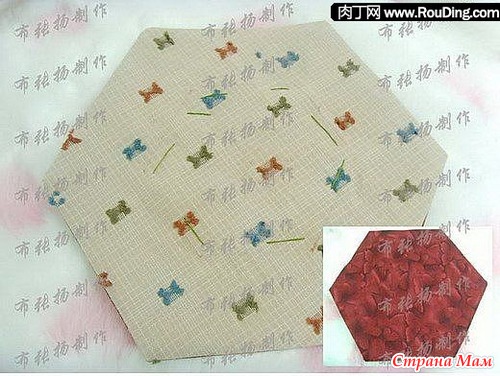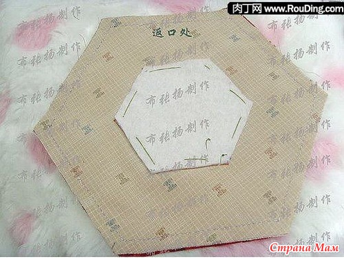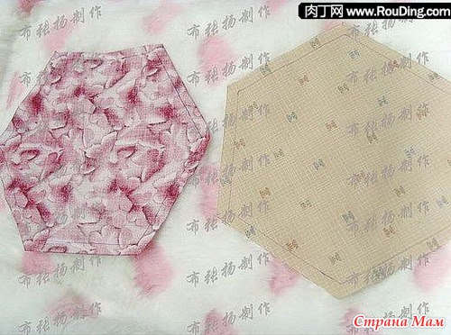 Затем прошиваем центральные точки каждой стороны шестиугольника, так чтобы цветная ткань оказалась внутри.