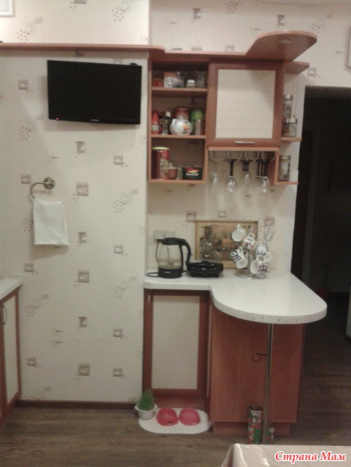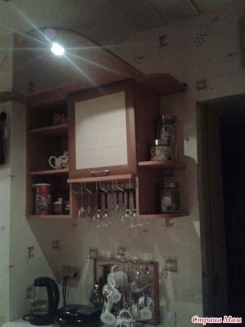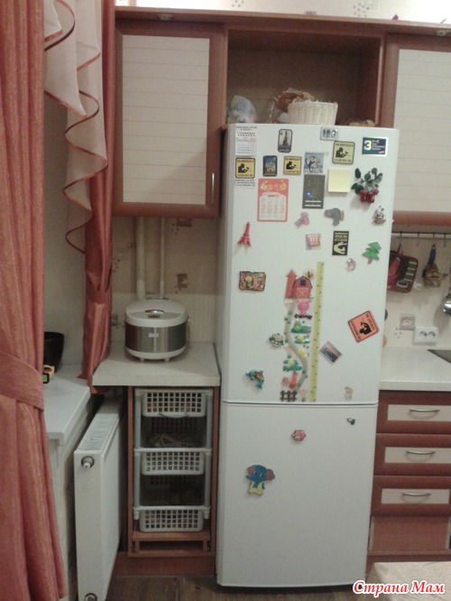 Над холодильником - полка для всяких вкусняшек к чаю. Планируем закрыть ее дверцей из ротанга. Недосток в этой полке один: она такая глубокая и высоко расположенная, что мы, закидывая в нее очередной пакет с печеньем, забываем про него. А к концу месяца выгребаем горы сухарей-сушек-печенюшек-корок-конфет.