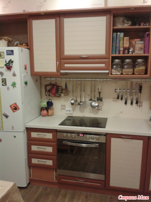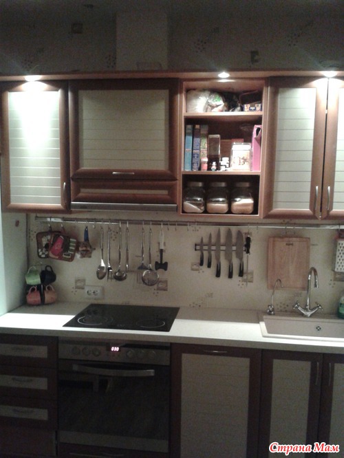 ) и встроенная варочная панель с духовкой. Господи, какое это наслаждение - готовить на плите, где конфорки разогреваются мгновенно, греют равномерно, где духовка - без вывертов, идеально ровная! У меня в жизни такого не было, вечно что-то подгорало-не пропекалось-убегало. На верхнем шкафчике опять же не хватает одной дверцы, причина та же самая, что и с барным шкафом