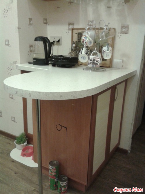 Справа от входа на кухню - барная стойка и барный шкафчик. Стойка не по-настоящему барная, (в смысле - высоты и наличия стульев), я планирую держать там вазы с цветами или фруктами. Внизу - вместительные шкафы. А еще - это моя любимая рабочая поверхность: я там и белье глажу и тесто раскатываю. Слева нет одной дверцы, это у мужа закончились доски, ждем поставки.