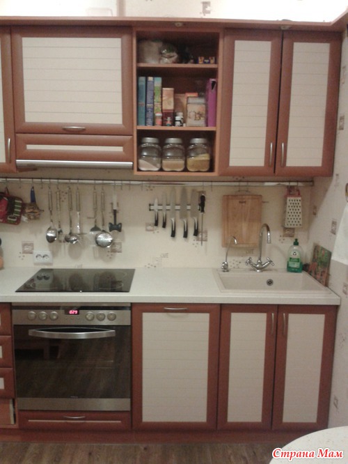 ) и встроенная варочная панель с духовкой. Господи, какое это наслаждение - готовить на плите, где конфорки разогреваются мгновенно, греют равномерно, где духовка - без вывертов, идеально ровная! У меня в жизни такого не было, вечно что-то подгорало-не пропекалось-убегало. На верхнем шкафчике опять же не хватает одной дверцы, причина та же самая, что и с барным шкафом