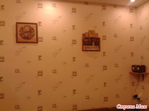 Стена над мягким уголком, стилизую ее под стену в кофейне. Буду всякие картинки вешать. Слева - вышитая картина домового! Подарила мне на новоселье замечательная страномамочка Shenlina!