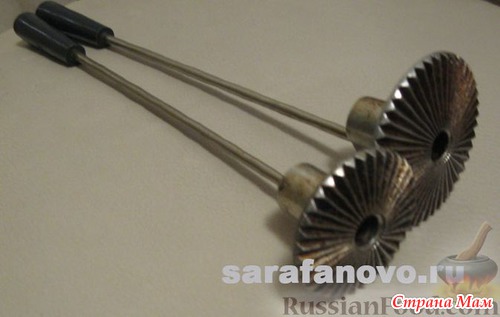 В небольшой емкости растопите жир в количестве, обеспечивающем возможность погружения в него формы. Доведите жир до кипения и проверьте готовность его к выпечке, опустив небольшой кусочек теста, как только тесто зарумянится, приступайте к выпечке. Опустите форму в кипящий жир и нагрейте её. Затем ребристую поверхность при помощи чайной ложки покройте тестом в 2-3 мм, опустите в жир и выпекайте до готовности.