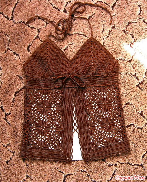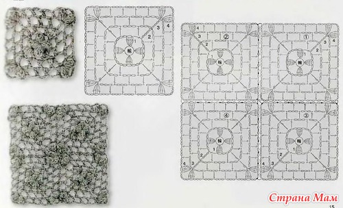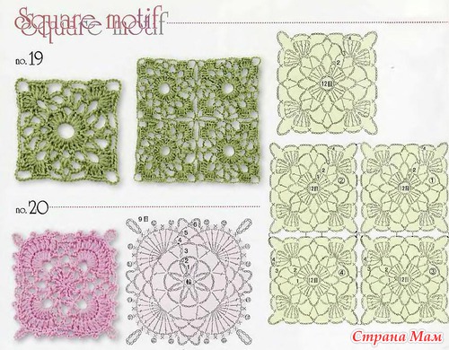 Для вязания нижней части топика можно использовать любые квадратные фрагменты и соединять их между собой. Я подобрала несколько похожих мотивов, которые вы сможете использовать для вязания этого топа.