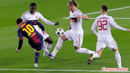 Но дома, на своем стадионе, забитом до отказа, это оказалась совершенно другая команда. Фантастическое преображение. Уже в первой половине встречи лидер Барселоны, Месси, пробил вратаря Милана дважды, причем примерно одинаковым методом - из-под ноги защитника Амброзини - только в первом случае мяч пошел верхом, под перекладину, а во втором - низом.