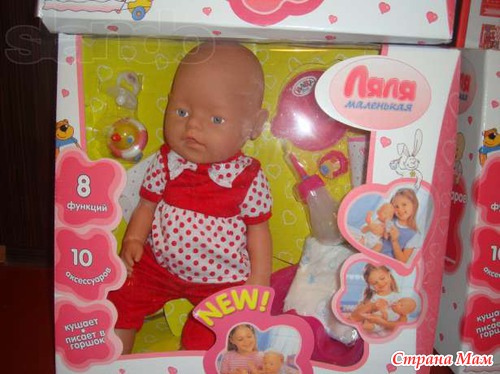 9 функций- пьет из бутылочки (простую воду), писает в пеленки, двигаются руки и ноги, писает горшок, плачет, текут слезки, куклу можно купать.
