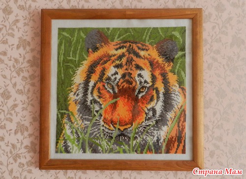 Очень всё красиво получилось - тигр шикарный и смотрится очень индивидуально удачный подбор!!! у вас очень хороший вкус вышиваю давно, но вот с подбором всегда тяжко, особенно если картина большая и многоцветная.