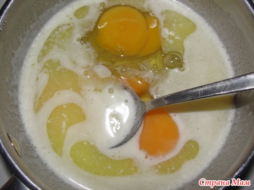 В охлажденное масло добавить яйца и хорошенько перемешать.