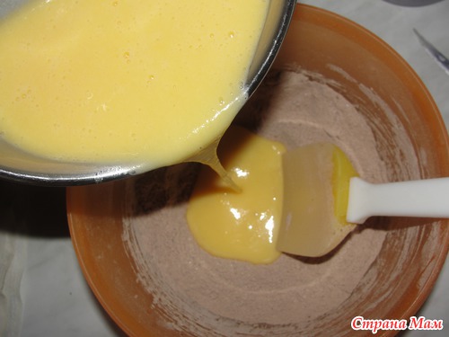 Яичную смесь добавить к сухим компонентам и все хорошенько перемешать.