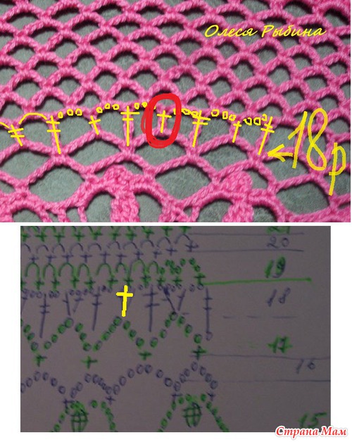 добавляю фото, отметила 18 ряд, который я переделала.вместо "галочки"из 2-х ст.-вязала 1 ст.