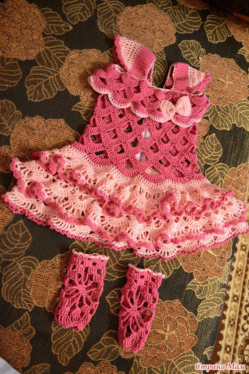 Наконец и я довязала платье с бантом, уж очень долго не доходили до него руки, а так хотелось его связать. Вот, что получилось. Дополнительно к платью связались гетры и сумочка.