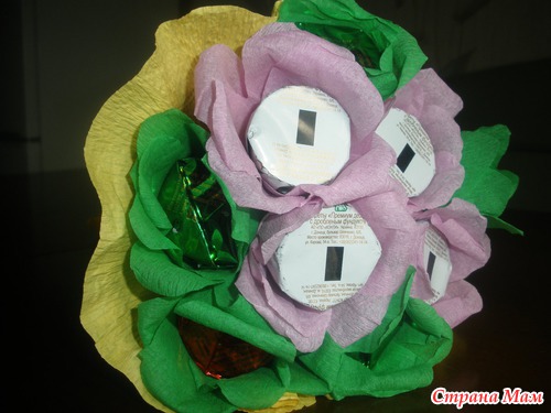Глядя на меня дочка тоже захотела сделать конфетный букет и вот что у нее получилось!