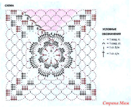 Ажурный мотив: вязать, как ажурный квадрат, но с 5-го р. вязать прямыми и обратными рядами, при этом не выполнять петли на розовом фоне.
