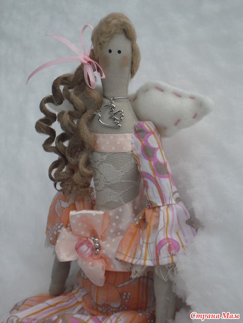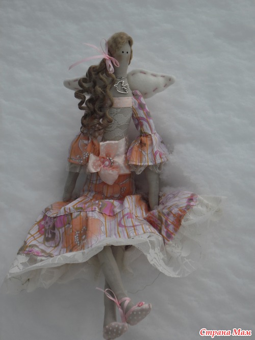 Для шитья феечки использовала бязь, гипюр, американский хлопок, атласные ленты, флис, волосы-шерсть для валяния, наполнитель-лебяжий пух.