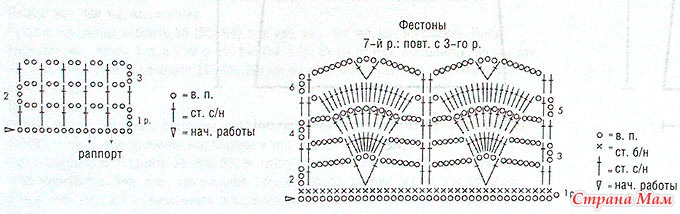 Узоры и виды петель В. п., ст. 6/н, ст. с/н, ст. «рачий шаг» (вяз. как ст. 6/н, но слева направо), филейная сетка по схеме, фестоны по схеме.