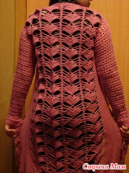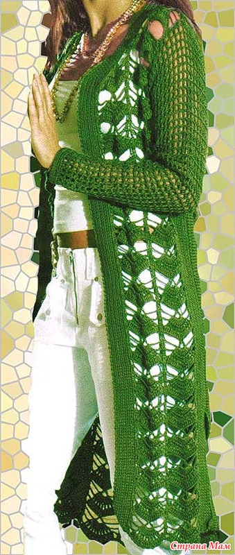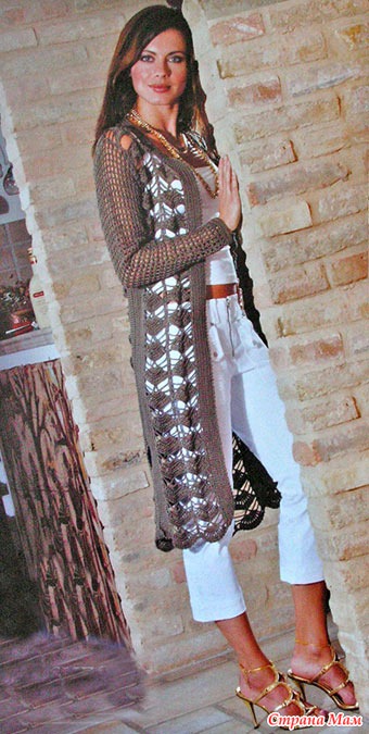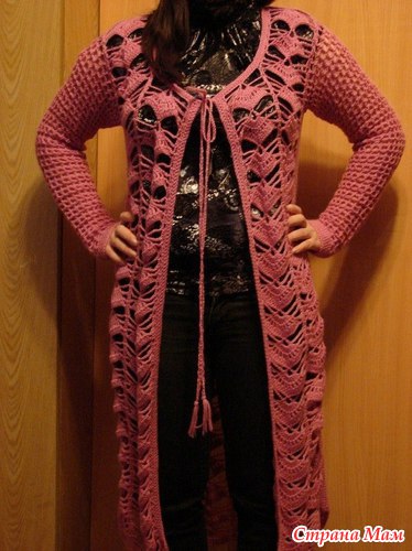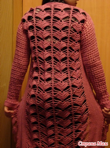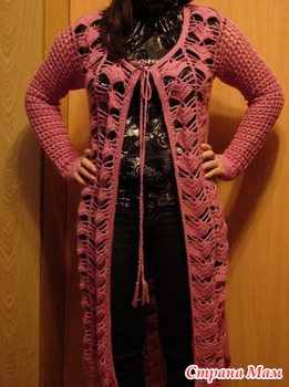 Поднять п. по одной из боковых стор. спинки до высоты на 79 см (начинать снизу), выполнить 150 ст. б/н и вяз. так 10 р., обрезать и закрепить нить. Так же обработать другую стор. спинки и боковые стор. полочек. Выполнить плечевые швы. Планки застежки, вырез горловины спинки и полочек обвязать 442 п. так же, как боковые стор. Одновременно для образования закругленной линии горловины провязать 2 п. в каждом р. угловыми петлями. Выполнить боковые швы, оставив снизу неза-шитыми 23 см (шлицы). Вшить рукава. Обработать шлицы, подол спинки, полочек, включая планки застежки, горловину ст. «рачий шаг». Обвязать манжеты 4 р. ст. б/н.