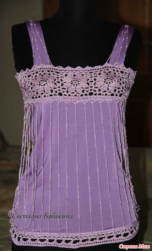 Связала дочери топик на лето, ниточки Тулип, израсходовала 1,5 мотка, по низу должны быть еще висюльки, но дочери не нравится с ними, говорит и нитки эти, которые по топику свисают, тоже убери. И что же тогда останется, вроде симпатичный топик получился, не знаю что и делать.
