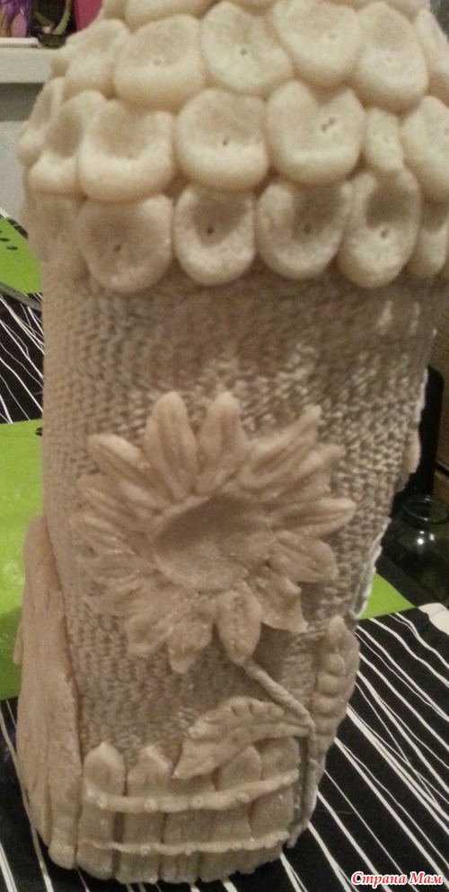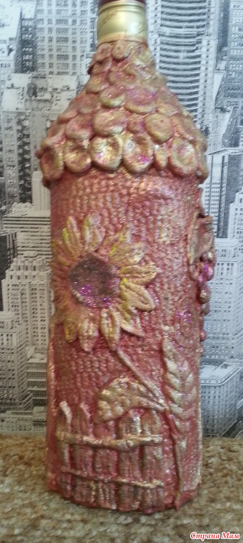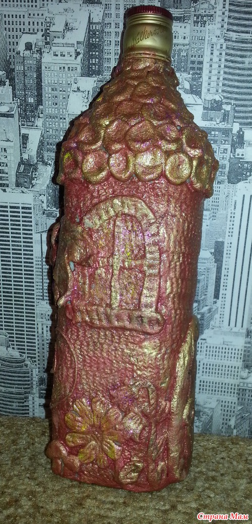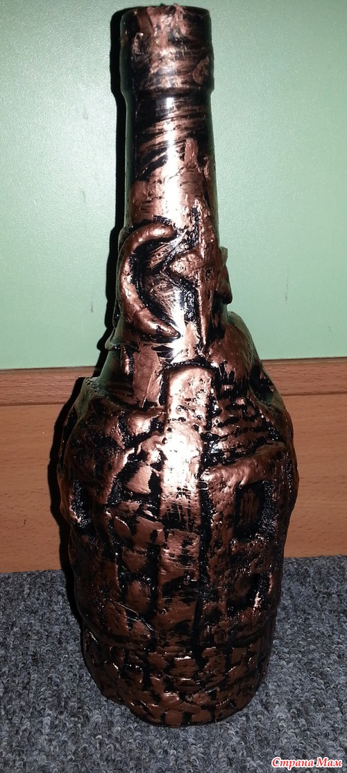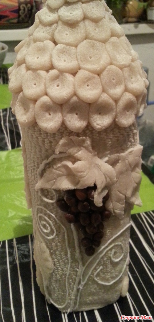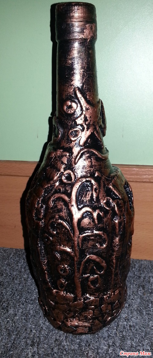 Обычное соленое тесто витиевато выкладываю на бутылку с виски или коньяком, сушу феном, что бы тесто не уползло )), в духовку не сунешь )), бутылочки с алкоголем ))), потом крашу и дарю друзьям ))) Достаточно бюджетно ( токо цена напитков ) + оригинальность подарка ( нынче, ведь, трудно удивить )... всем нравится ))))). А научилась тут, подсмотрела ))) Спасибо )))