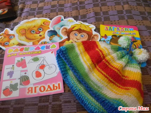 Сыочка знал что не зря первым носяру в коробочку сунул - досталось ему не мало. Книжки, раскрасска и веселая шапока, которая тут же была примерена
