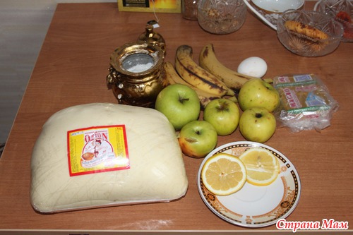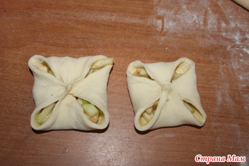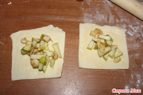 Далее тесто разрезаем на квадратики, смазываем сливочным маслом и выкладываем на серединку нашу фруктовую начинку