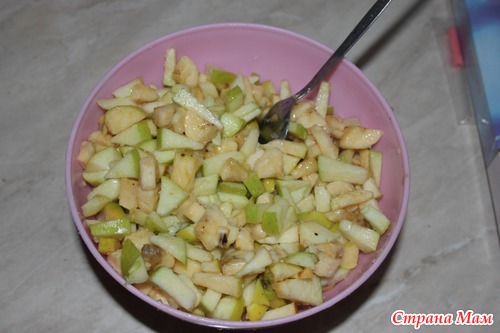 Фрукты моем, чистим и режем мелко, сыпем 1,5-2 ст. ложки сахара
