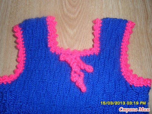 Связала сарафанчик для внучки - пряжа Пехорка детская новинка, ушло ровно 2 моточка(всего 100гр), фасон и описание брала на Осинке. Только я вязала не на круговых спицах, а на простых - отдельно перед и спинку.