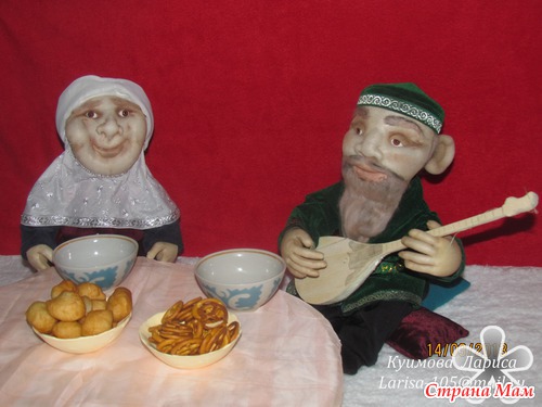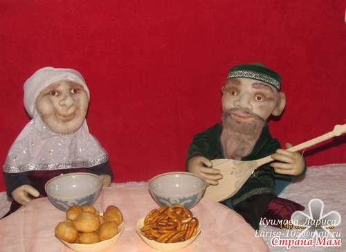 Вот для выставки приготовила центральные фигуры. Бабушка и дедушка казахи в национальных одеждах. Правда баурсаки, лепешки будут из соленого теста. ну и еще планирую часть юрты изобразить. пока на ваш суд вот так -черновой вариант так сказать.
