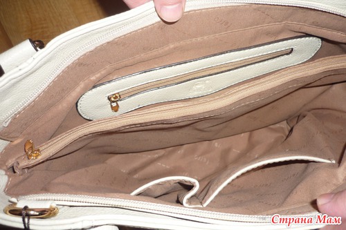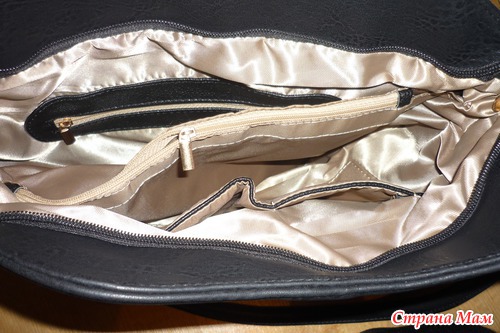 Внутри два отдела, вместительный карман на молнии, кармашек для документов тоже на молнии и кармашки для мобильника и всяких мелочей