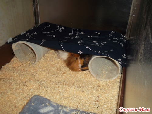 Тоже рыжуха выглядывает из под гамака, трубы все время переставляются жителями по клетке