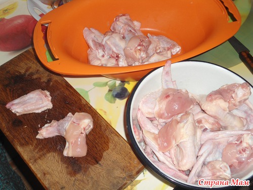 . Капама - блюдо болгарской кухни и рецептов ее великое множество. В моем исполнении - самый простой рецепт и что не маловажно - готовится очень быстро. Я беру 1 кг крыльев и разрезаю их на две части, складываю в казан или другую посуду в которой будет готовится капама
