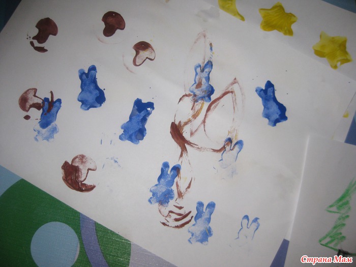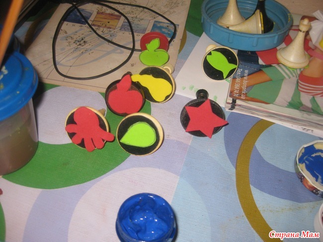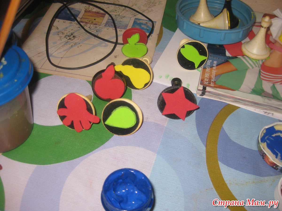 Когда штампики приклеились, начали рисовать. Макали в краску гуашь. Получилось местами не очень, первый раз штампик с краской лучше штампонуть на ненужной бумажке, потом на картинку- получается четче: