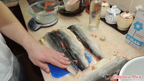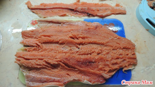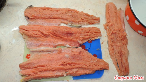 У нас было 2 средних горбуши. Промыли, обсушили салфеткой. Разрезали, очистили от хребтов и костей.