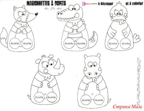 Распечатайте на принтере и раскрасьте. Не забудьте вырезать дырочки для пальчиков. Театр готов!