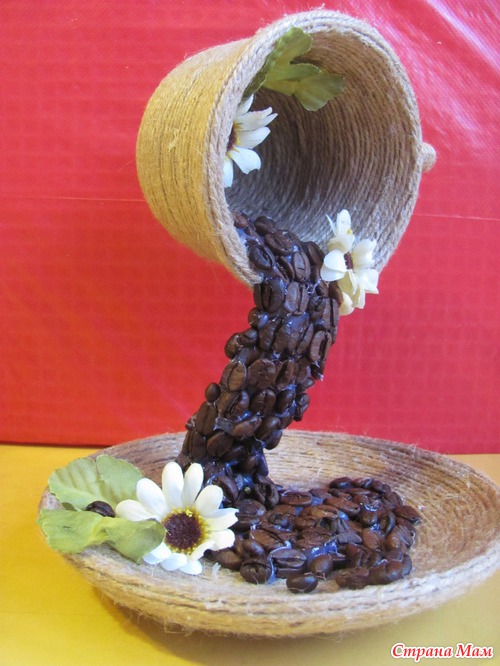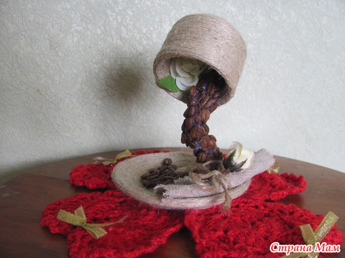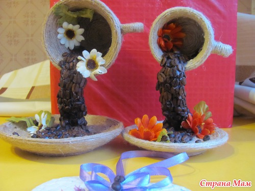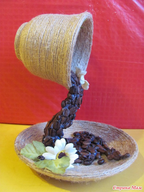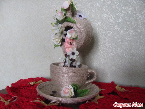 Обклеиваю шпагатом чашку, блюдце и молочник. супер клеем приклеиваю чашку к блюдцу и алюминиевой или толстой медной проволокой на пистолетный клей приклеиваю каркас струи. Жду час и заливаю эпокситкой. Жду еще час и наклеиваю пистолетным клеем кофе, цветы, бусины и листочки.