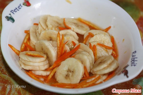 Бананы очистить от кожуры и нарезать кружками. Сложить в миску, добавить цедру, апельсиновый сок и ликер. Аккуратно перемешать и оставить на 30 минут.
