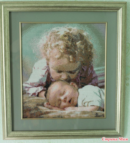Вышивала эту картину когда забеременела первой доченькой!!! Беременность была долгожданная, в это время я была просто помешана на таких картинках, да и просто очень тронула меня эта вышивка... И вот представляете, оказалась она для меня пророческой! Сейчас доченьке 4 годика, а моему сынишке 5 месяцев. Он даже похож на малыша из картины... Может поэтому она мне очень дорога!!!