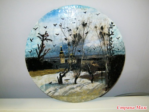 Декупаж с подрисовкой по мотивам картины Саврасова "Грачи прилетели".