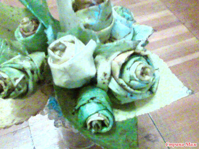 Могу еще добавить, что наружние листья еще свежими прогладила утюгом, а сами розочки кисточкой смазывала растительным маслом (идеи не мои), благодаря этому букет не деформируется и не ссыхается.