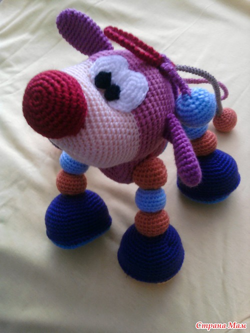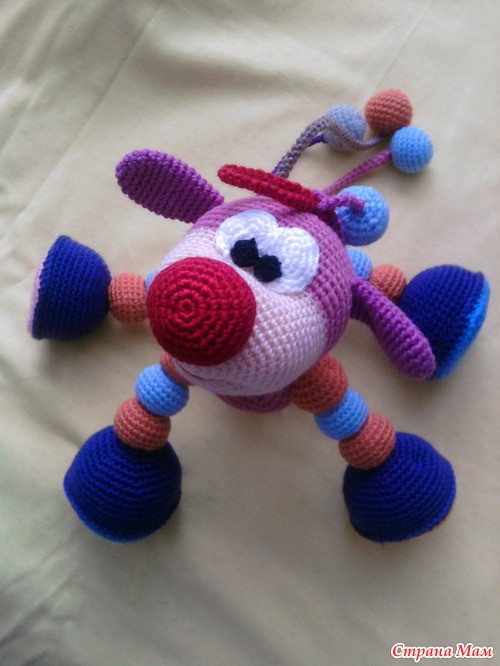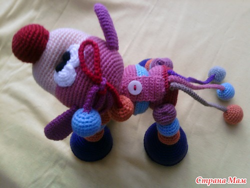 Вот такая развивающая игрушка связана была для игры на одном из форумов. Назвала ее Лошарик - как мультик когда-то был. Лошарик чудесный - в одной ножке у него фасолька, в другой - горох, в третьей - пакетик шуршит, четвертая звенит. Хвостик завязывается или заплетается - как ребенку нравится.