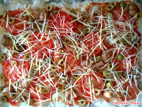 , а сверху мука. Руками замесила, на противень выложила. Пиццу решила забабахать