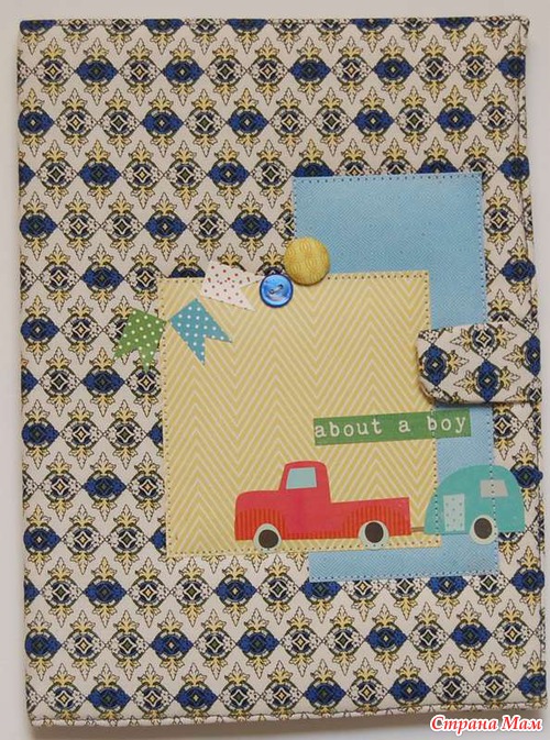 На обложке машинки (мальчик все-таки)), флажки, пуговка, брадс... ООО и закрывается папка на липучку - мега удобно )))