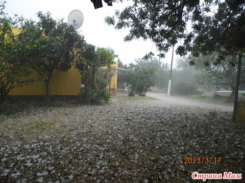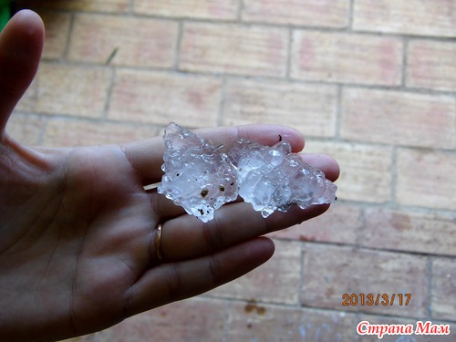 Ой, что у нас сегодня было... град. Для нашего региона -это нонсенс. У нас сейчас весна полным ходом: буйство красок, запахов. Трава по-пояс, все цветет, а запах-аж пьянит. Правда в этом году еще холодно, раньше в это время было уже тепло даже очень. И вот... сегодня утром гремит гром, а потом начинает стучать по крыше да так сильно, что кажется, что с неба сыпятся камни. Выскакиваем с мужем на крыльцо и видим... Смотрите сами.