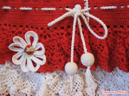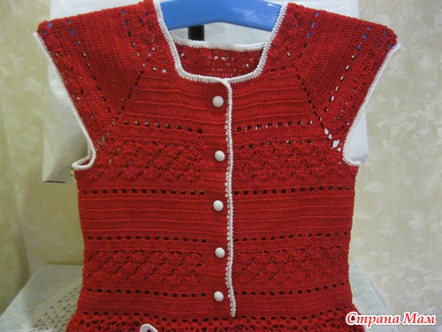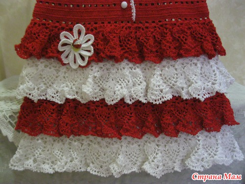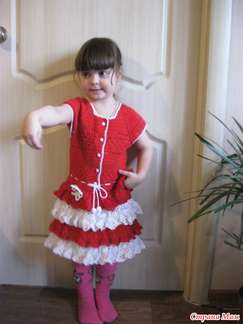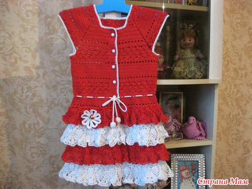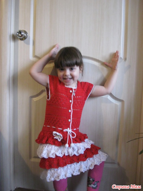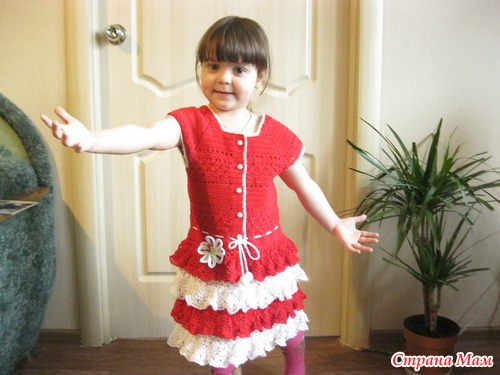 Захотелось связать его внучке для детского сада. Конечно же, изменила орнамент в вязании верха платья, в воланах юбочки добавила рядки и связала их немного по-своему.