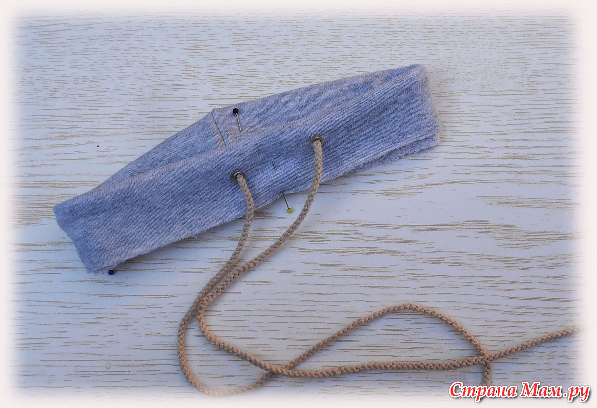 В пояс вставляем шнурок (подходящего шнура не нашла, пришлось быстренько сплести). Если хотите вставить резинку, то отмеряйте резинку нужной длины, сшейте ее в круг и вложите в пояс.