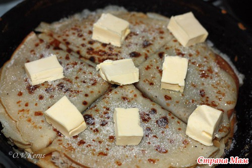Каждый блин слегка смазать сливочным маслом, присыпать сахарным песком. Свернуть в четыре раза. Сложить блины в кастрюлю, сверху посыпать 2ст. л. сахара и положить сливочное масло.
