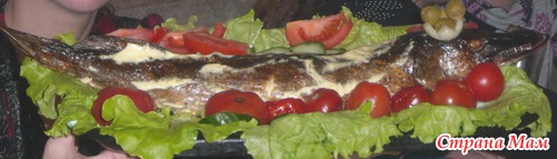 Далее совсем немного. Берем иголку и делаем в нескольких местах проколы. Это поможет во время запекания не треснуть. Ставим ее в холодную духовку, устанавливаем температуру равную 190 гр. Рядом с духовкой ставим стакан с теплой кипяченной водой. Ей мы будем поливать рыбу в процессе запекания. Открываем духовку первый раз примерно через 20 минут, потом с периодичностью для поливки ее водичкой при помощи столовой ложки. На все запекание уходит примерно минут 50. Это еще зависит и от размеров рыбы. На готовность я ориентируюсь по глазам:белые и вылизают на лоб. Тогда я беру ее и просто смазываю майонезом и опять в духовку до румяной корочки.
